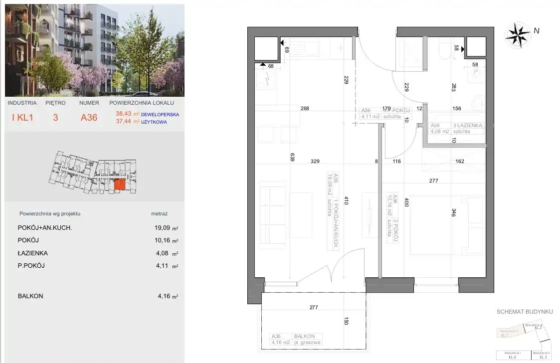 - Charakterystyka mieszkania 37.44 m2, 2 pokoje