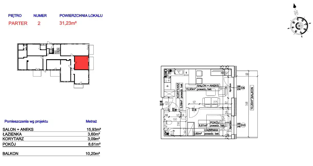 - Charakterystyka mieszkania 31.23 m2, 2 pokoje