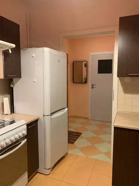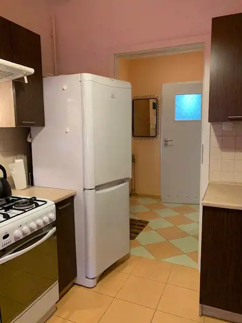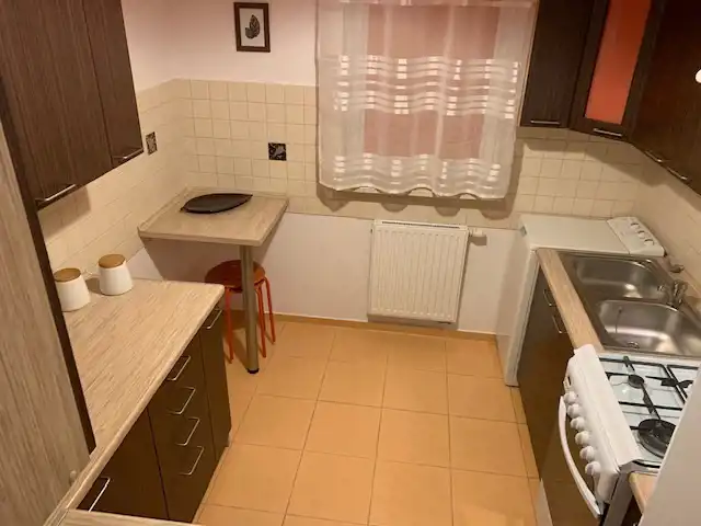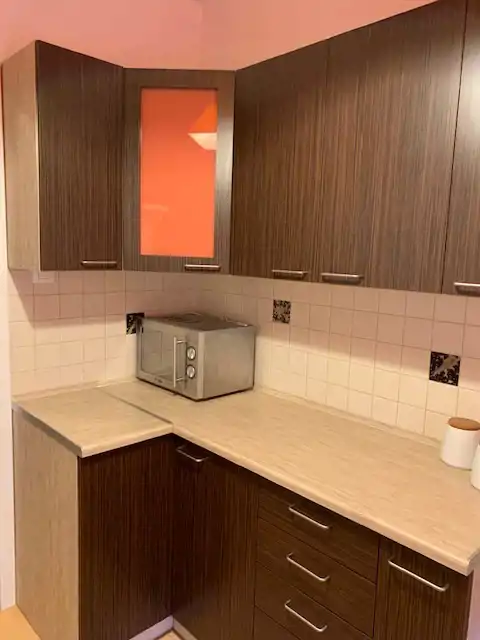 Oddzielna kuchnia o pow. 6,6m2. podłoga w płytkach i pas roboczy, meble kuchenka z piekarnikiem, duża lodówka, pochłąniacz pary, zadbane, czyste.
