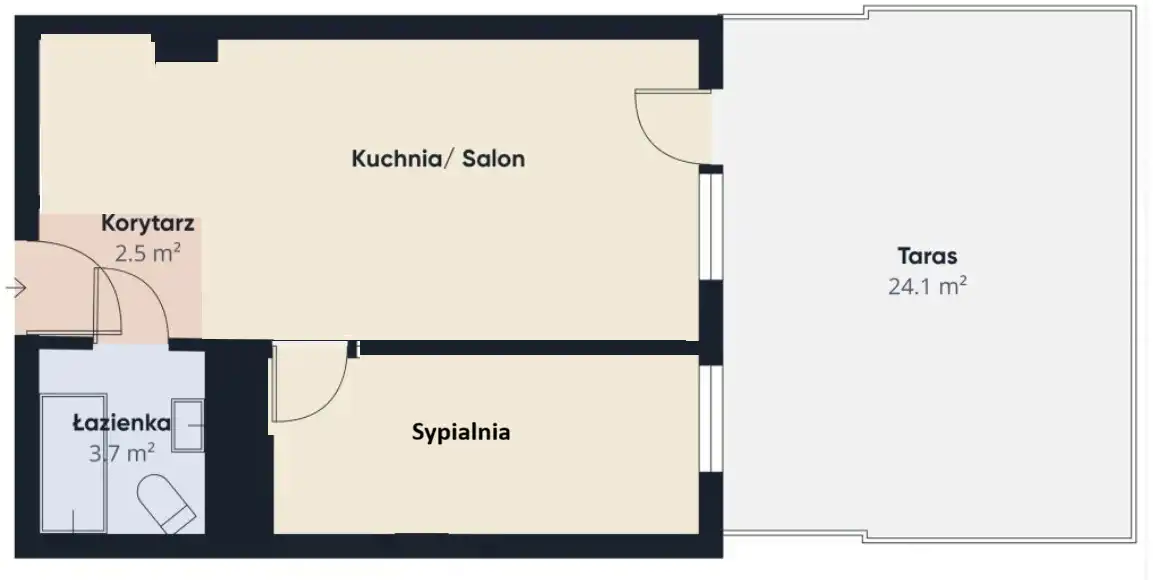 Obecnie mieszkanie funkcjonuje jako kawalerka, jednak istnieje możliwość wydzielenia dwóch pokoi. Dzięki korzystnemu układowi przestrzeni można stworzyć salon z aneksem kuchennym oraz osobną sypialnię. Proponowany projekt przeróbki został przedstawiony na zdjęciach, co ułatwia wyobrażenie potencjału aranżacyjnego nieruchomości.
