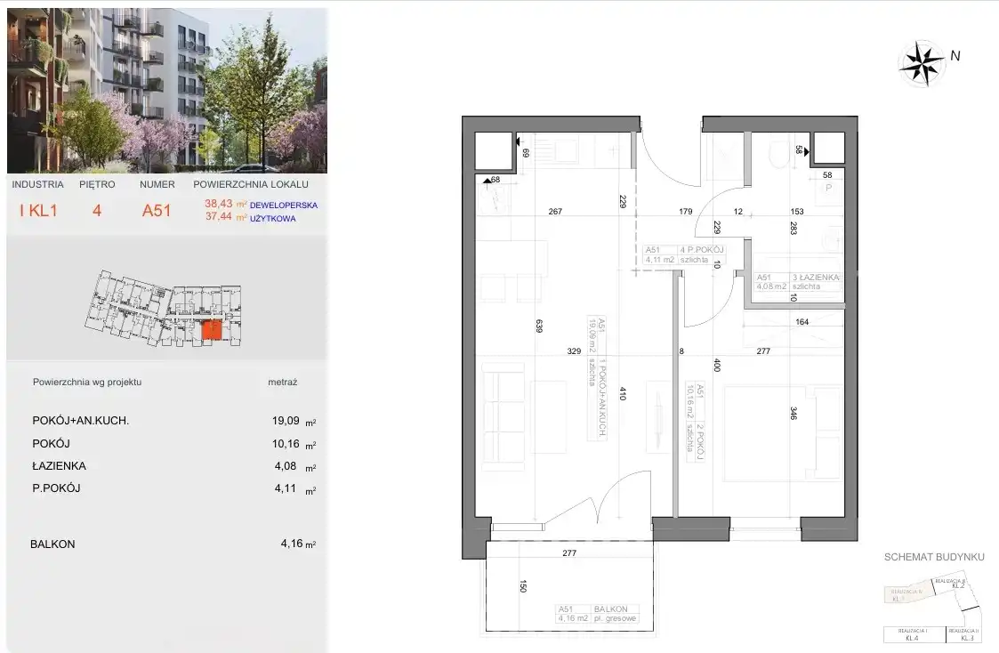 - Charakterystyka mieszkania 37.44 m2, 2 pokoje