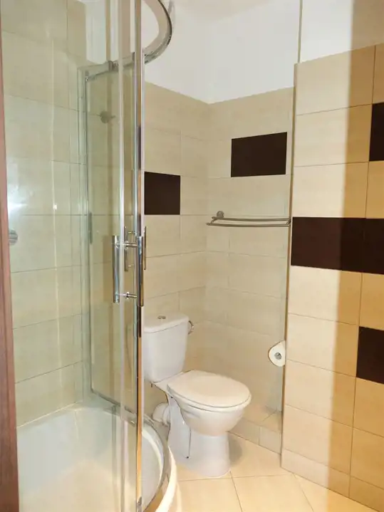 ŁAZIENKA Z WC o pow. 4,30m2. - kabina prysznicowa, pralka, glazura i terakota, szafka.