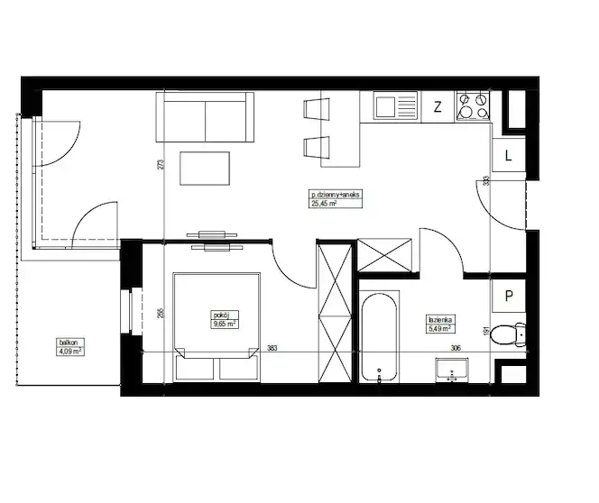 - Charakterystyka mieszkania 40.59 m2, 2 pokoje