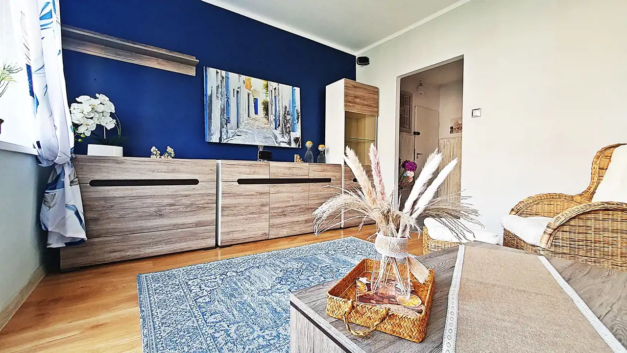 - klimatycznie urządzony salon – 16 m2 - z wyjściem na balkon, z wygłuszoną ścianą za TV i rozprowadzonym nagłośnieniem