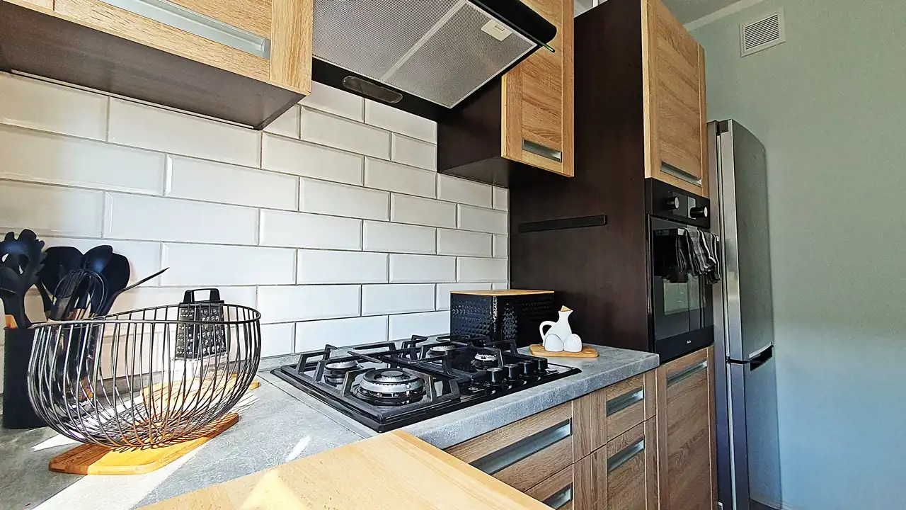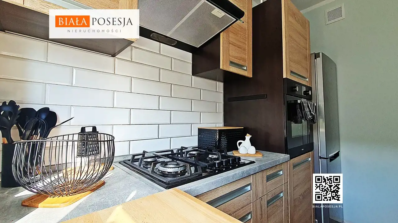 - dwuletnia, nowocześnie zaprojektowana na wymiar kuchnia – 8 m2 - z dużą zmywarką (60-ką) i płytą gazową renomowanej Firmy Electrolux, piekarnikiem w słupku polskiej Firmy Amica, dużą lodówką znanej Firmy Samsung, okapem Indesit i mikrofalą Amica