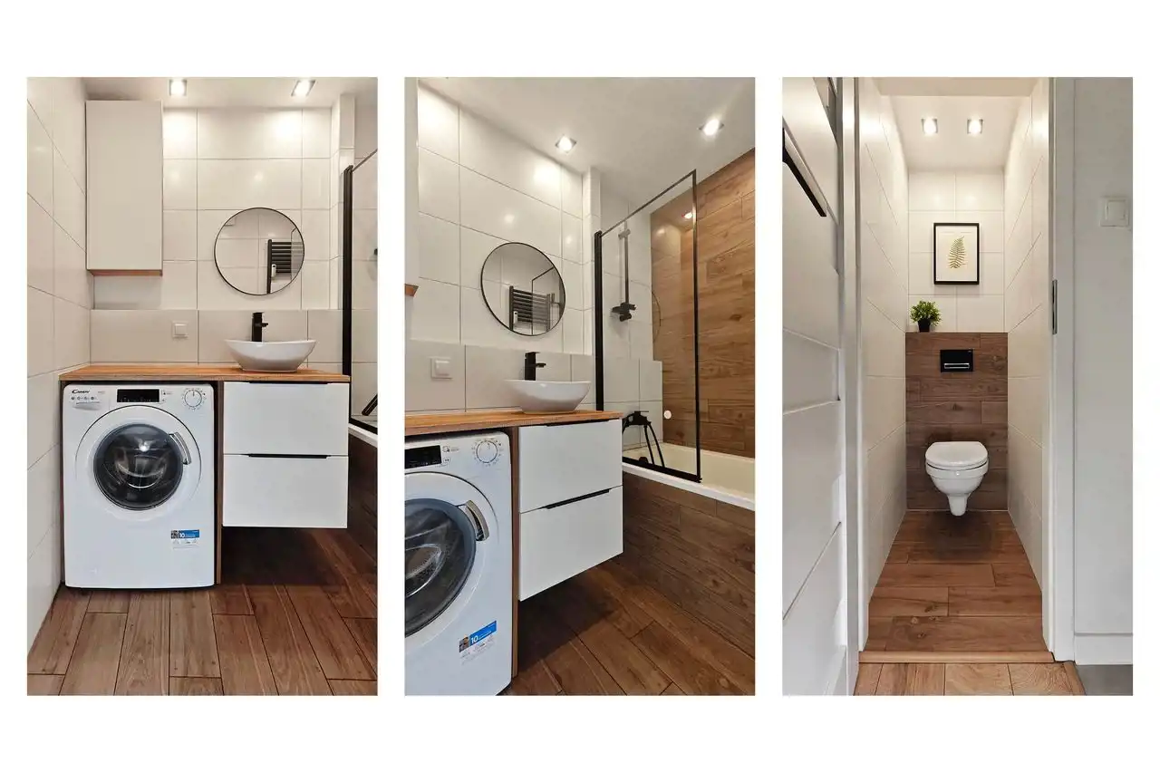 Łazienka została zaprojektowana z dbałością o każdy detal – nowoczesna wanna z funkcją prysznica, elegancka umywalka nablatowa, subtelne oświetlenie i drewnopodobne wykończenie nadają jej stylu i ciepła. Zabudowana pralka i przemyślana przestrzeń do przechowywania sprawiają, że jest nie tylko ładnie, ale i praktycznie. Oddzielna toaleta utrzymana w tym samym stylu – minimalistycznie i elegancko.