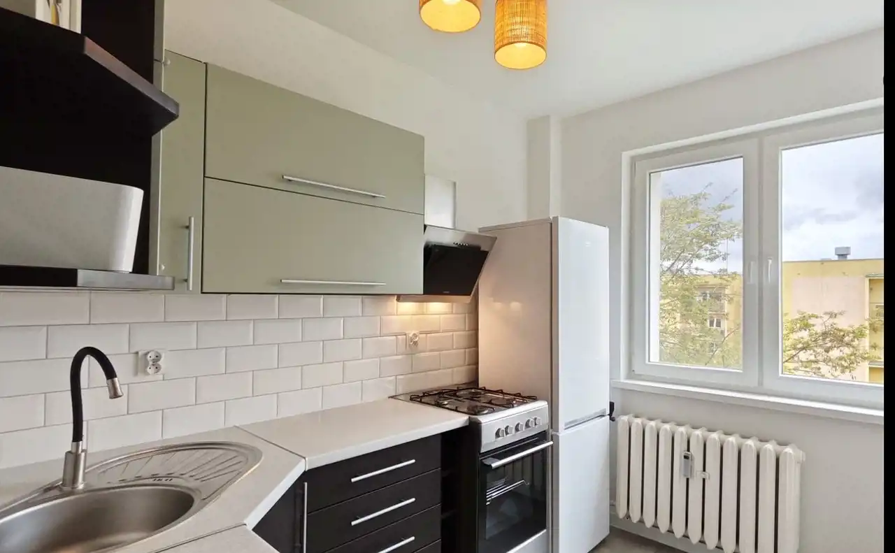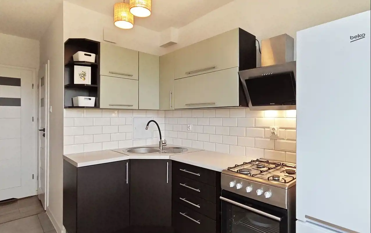 Kuchnia jest nowoczesna, a przy tym przytulna. Kontrastowa zabudowa w odcieniach oliwkowej zieleni i czerni, białe kafelki typu "cegiełka" i duże okno sprawiają, że kuchnia jest pełna światła i energii. To idealne miejsce do porannej kawy i gotowania ulubionych potraw. Sprzęty AGD są na miejscu – lodówka i kuchenka gotowe do pracy.