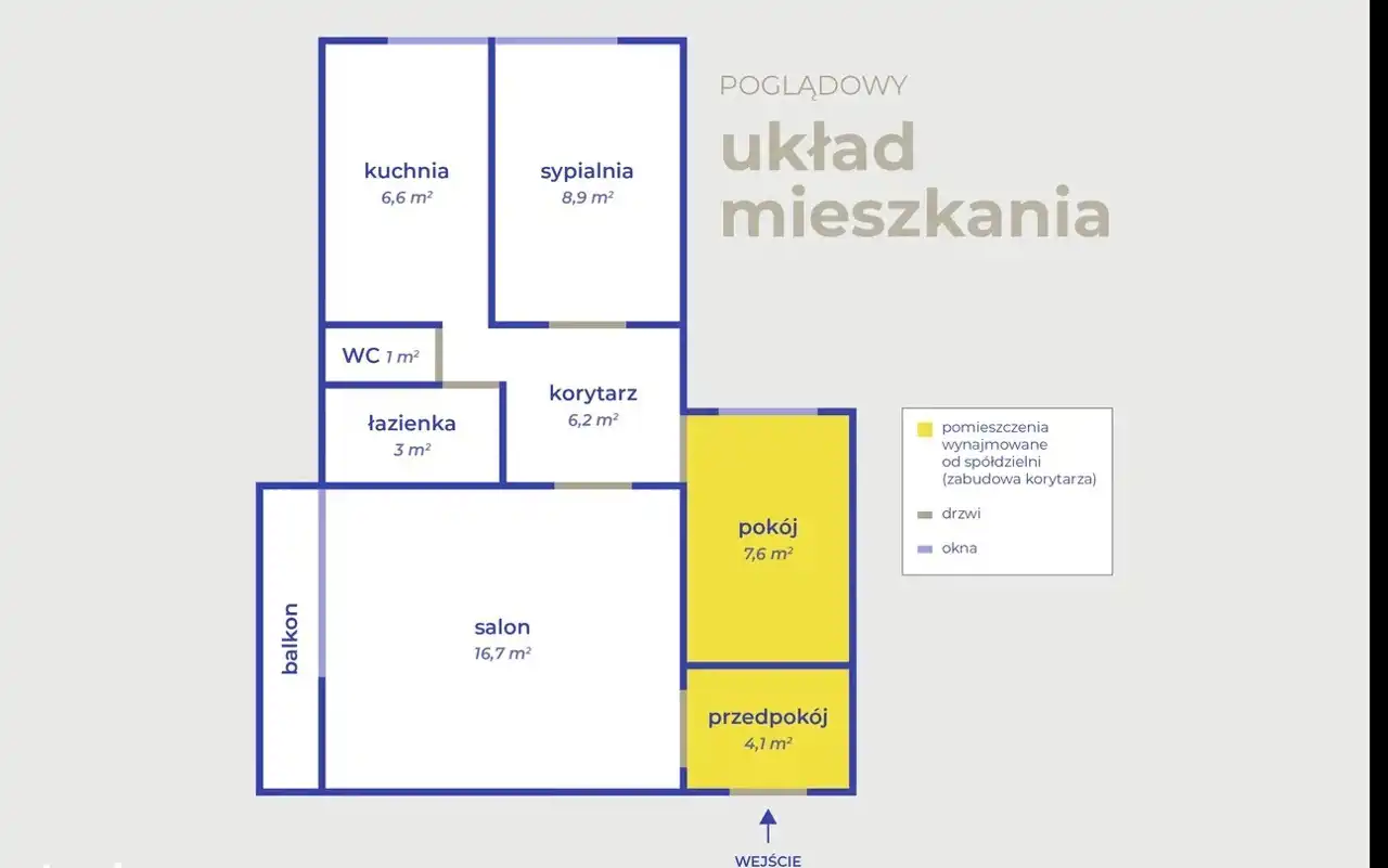 - 11,67 m² – zabudowa korytarza wynajmowana od spółdzielni.
