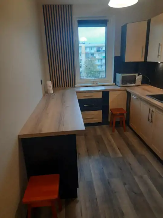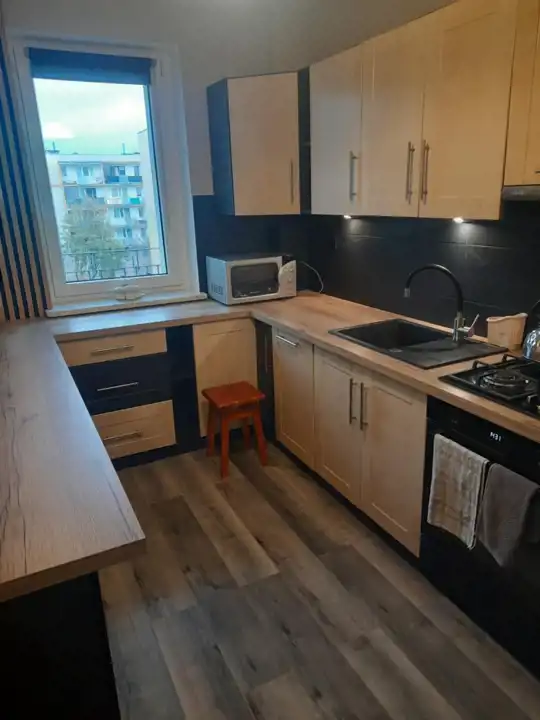 W cenie pozostaje zabudowa kuchenna wraz ze sprzętem AGD ( oprócz lodówki ), narożnik w dużym pokoju, umeblowanie przedpokoju, szafa typu komandor w małym pokoju.