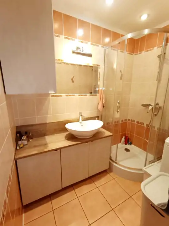 Łazienka (3,2 m²) z kabiną prysznicową, osobne WC (1 m²).