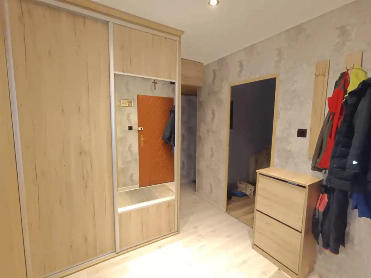 Przedpokój z pojemną szafą w zabudowie – podobnie jak w pozostałych pokojach, co zapewnia dużo miejsca do przechowywania. Drzwi wejściowe podwójne.