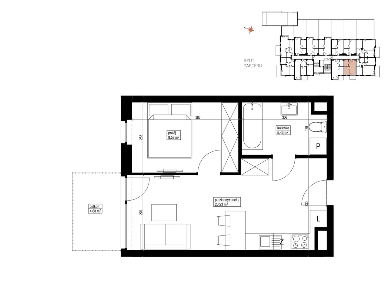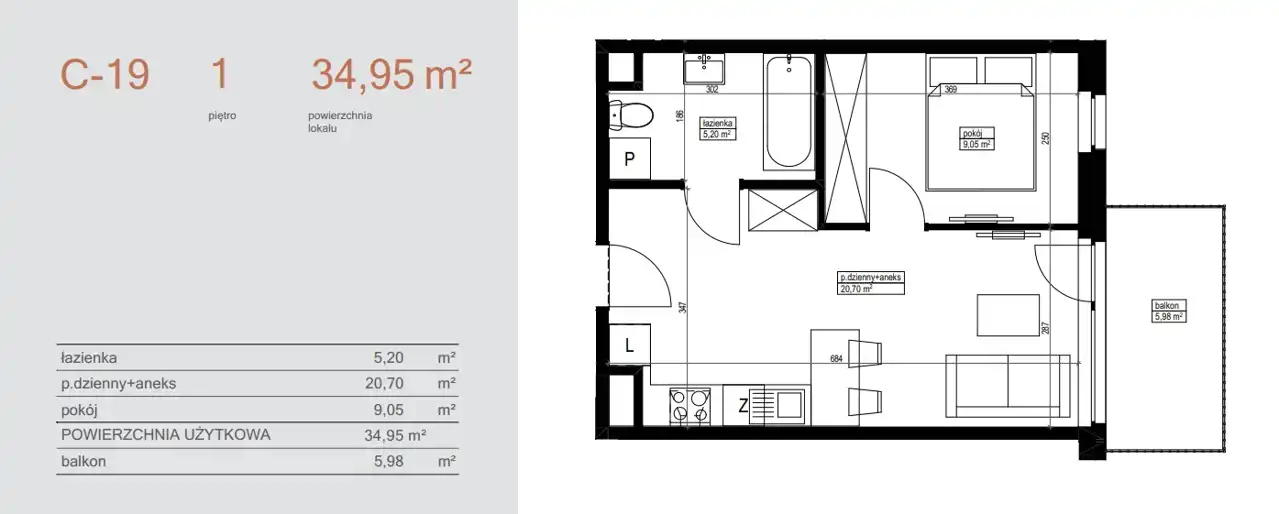 - Charakterystyka mieszkania 34.95 m2, 2 pokoje