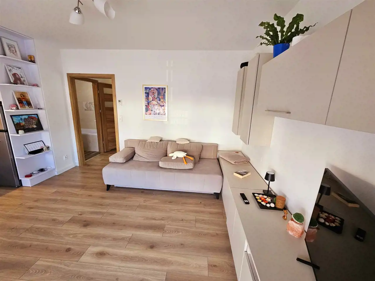Salon z aneksem kuchennym to serce domu. Tu spędzisz wolny czas i wspólnie przygotujesz posiłki z całą rodziną. Będąc przy kuchni, nie przegapisz wydarzeń w telewizji czy Twoim ulubionym serialu. Jasne meble, podłoga utrzymana w drewnianym, rustykalnym stylu oraz nowoczesny aneks z indukcją, piekarnikiem i miejscem na lodówkę - to salon marzeń! W pełni wykorzystana przestrzeń sprawia, że jest tu sporo miejsca - także na stół.