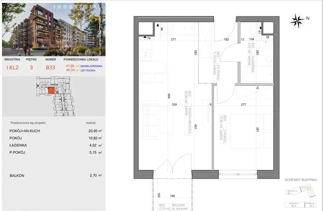 - Charakterystyka mieszkania 40.94 m2, 2 pokoje