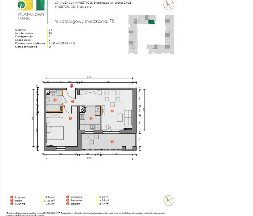 Mieszkanie znajduje się na II piętrze na nowym prestiżowym osiedlu Platanowy Park - Osiedle Leśne. Powierzchnia (51,42 m2) 52,56 m2 zgodnie z normą PN-ISO 9836:1997 wraz ze ścianą działowymi nadającymi się do demontażu oznaczonymi kolorem pomarańczowym.