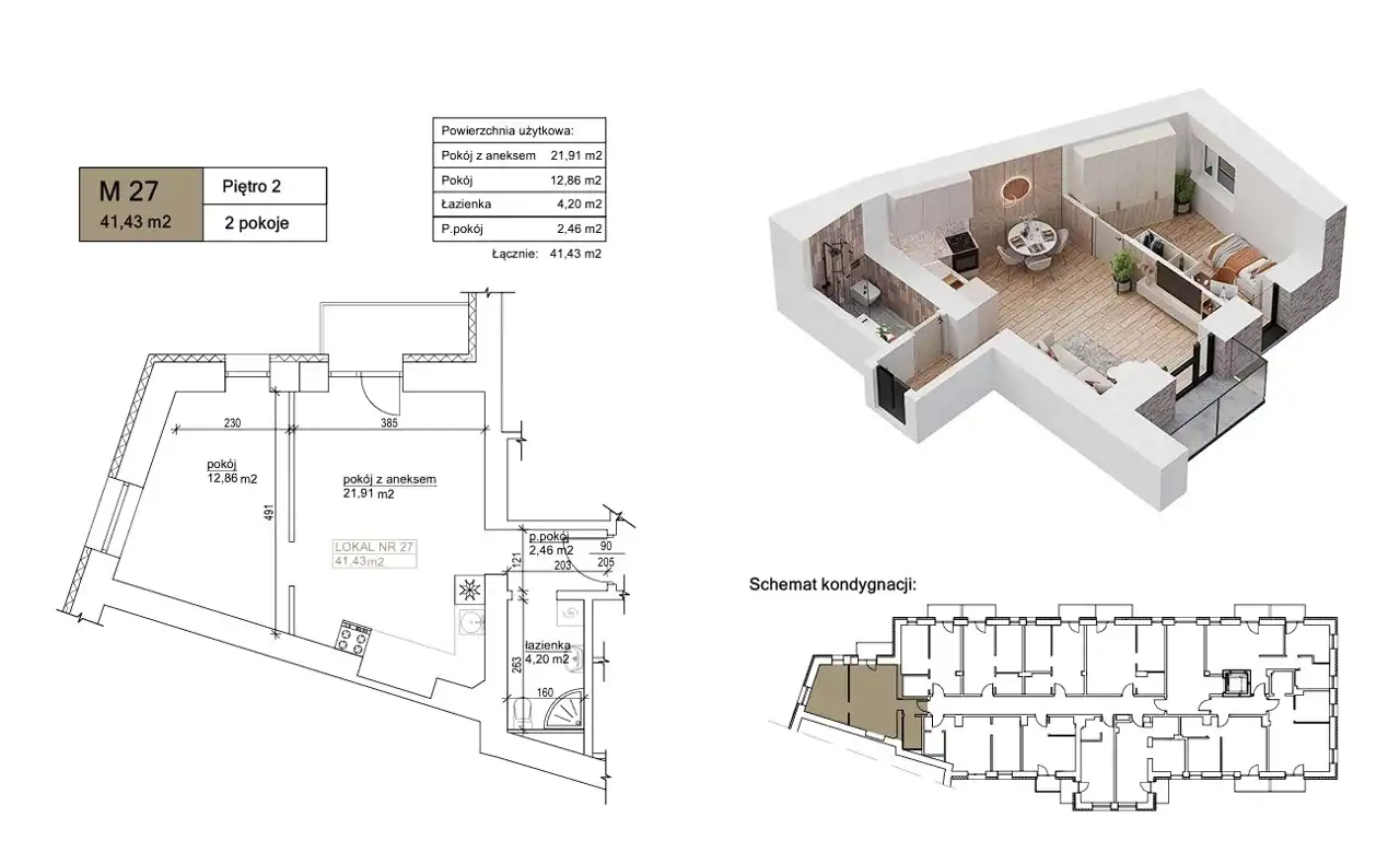 - Charakterystyka mieszkania 41.43 m2, 2 pokoje