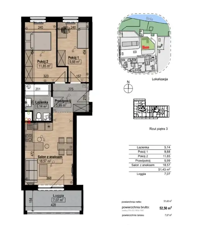 - Charakterystyka mieszkania 52.5 m2, 3 pokoje