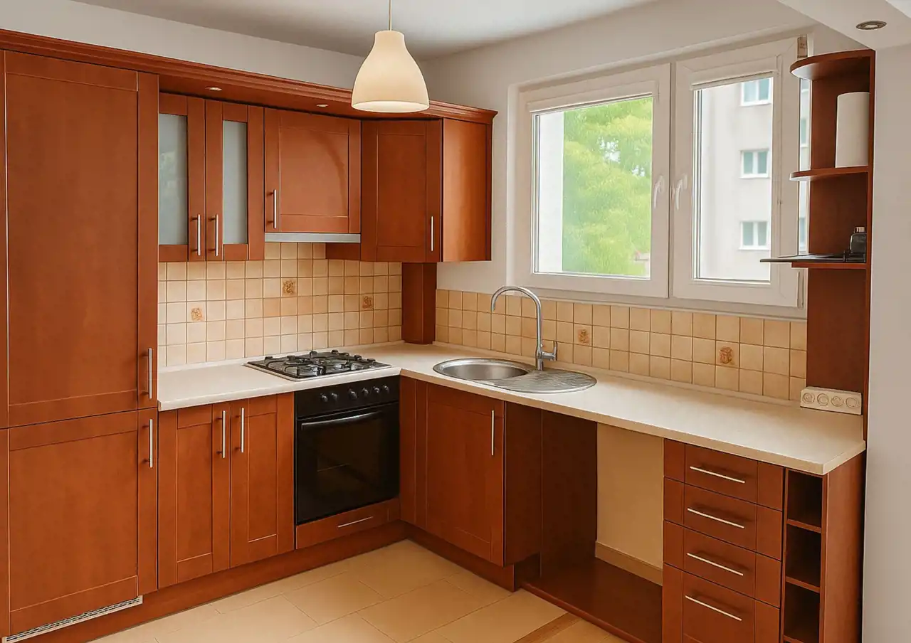 Kuchnia w zabudowie, wyposażona i gotowa do użytku