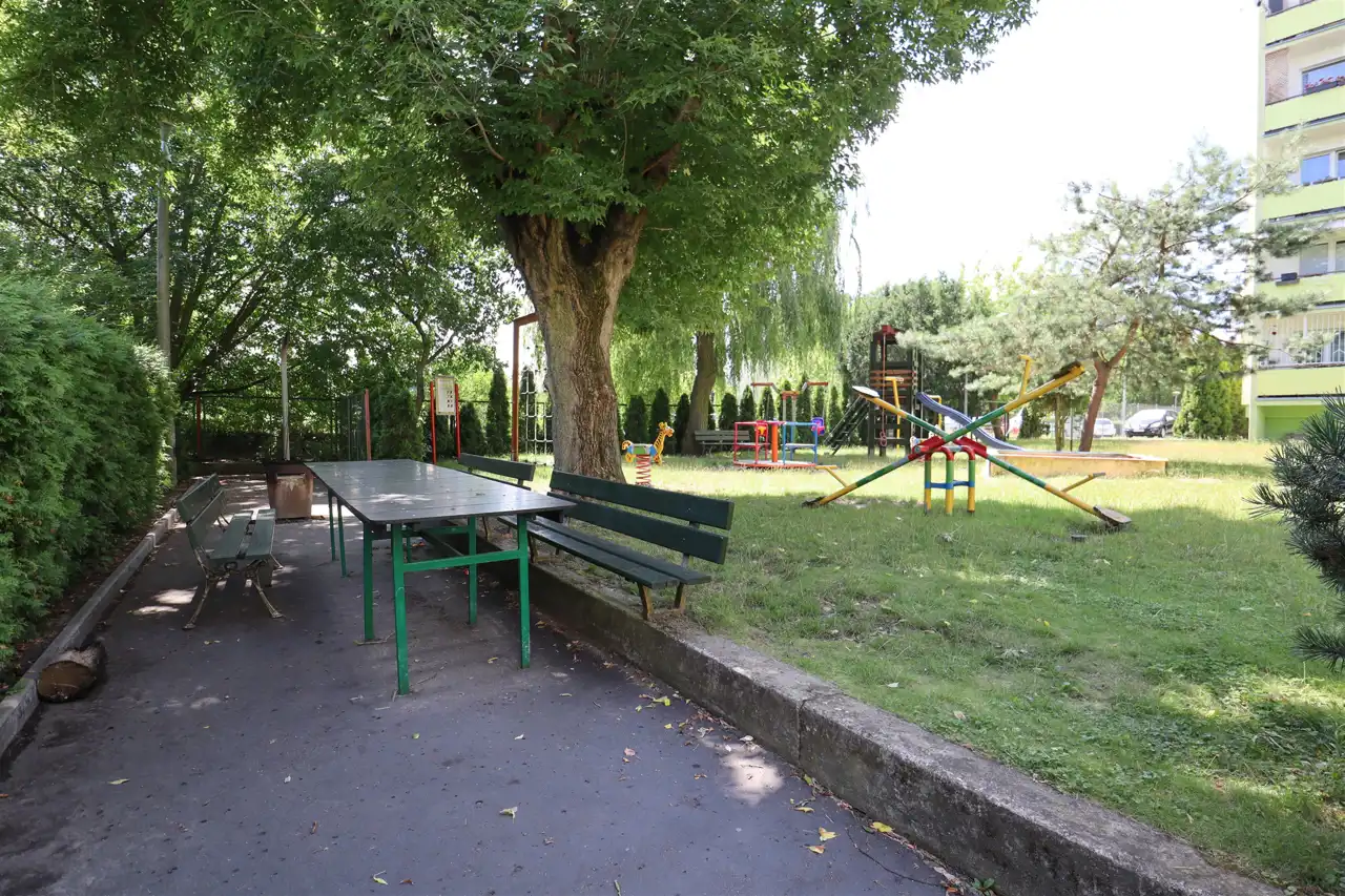 Teren wokół budynku jest pięknie zagospodarowany z doskonałym placem zabaw.