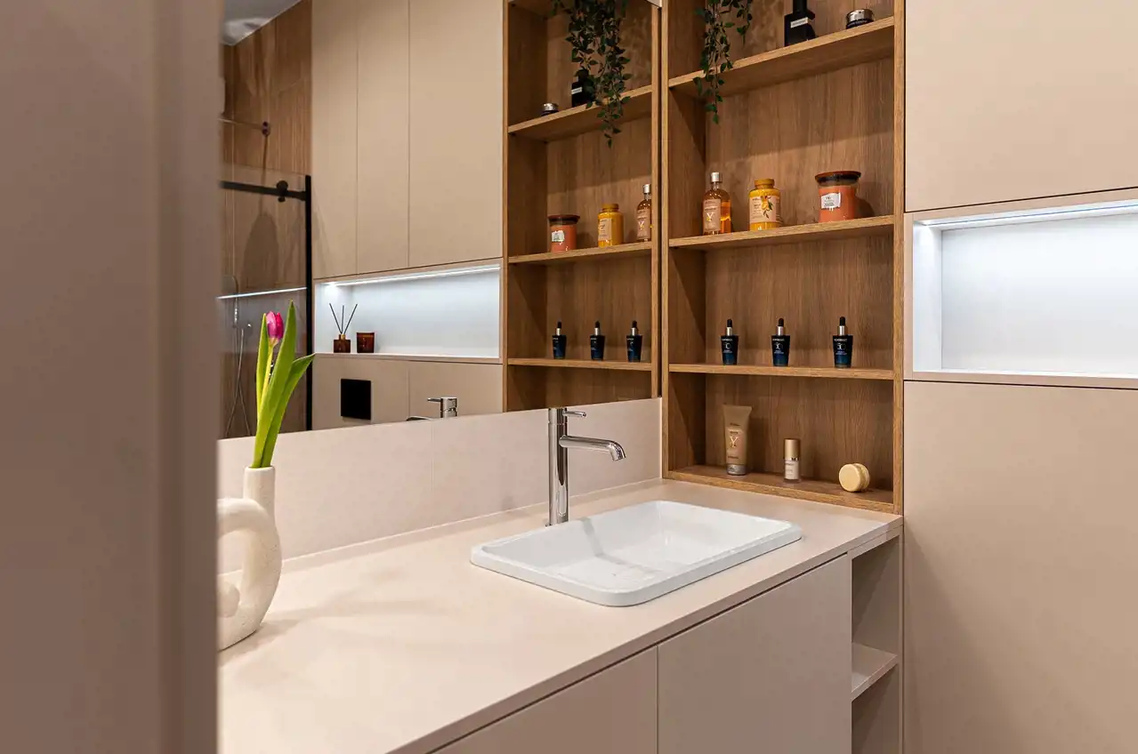 Wnętrze umeblowane zostało w zabudowy stolarskie wykonane na zamówienie: kuchnia, zabudowa w przedpokoju, pojemna szafa garderobiana, blat roboczy pełniący również funkcję stołu lub biurka, a także meble łazienkowe. Dodatkowo w cenie pozostają meble ruchome, m.in. rozkładany narożnik, stolik kawowy, krzesła oraz ławka.