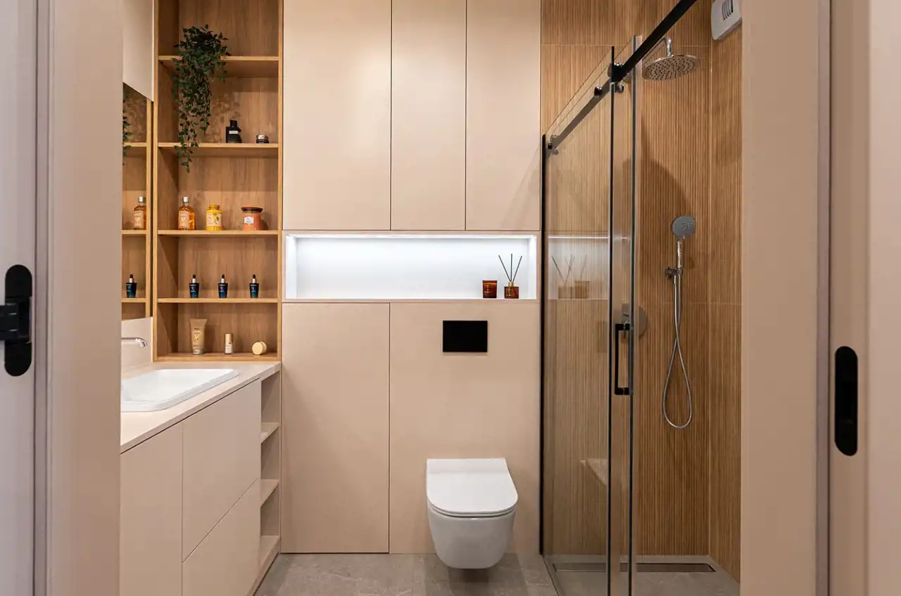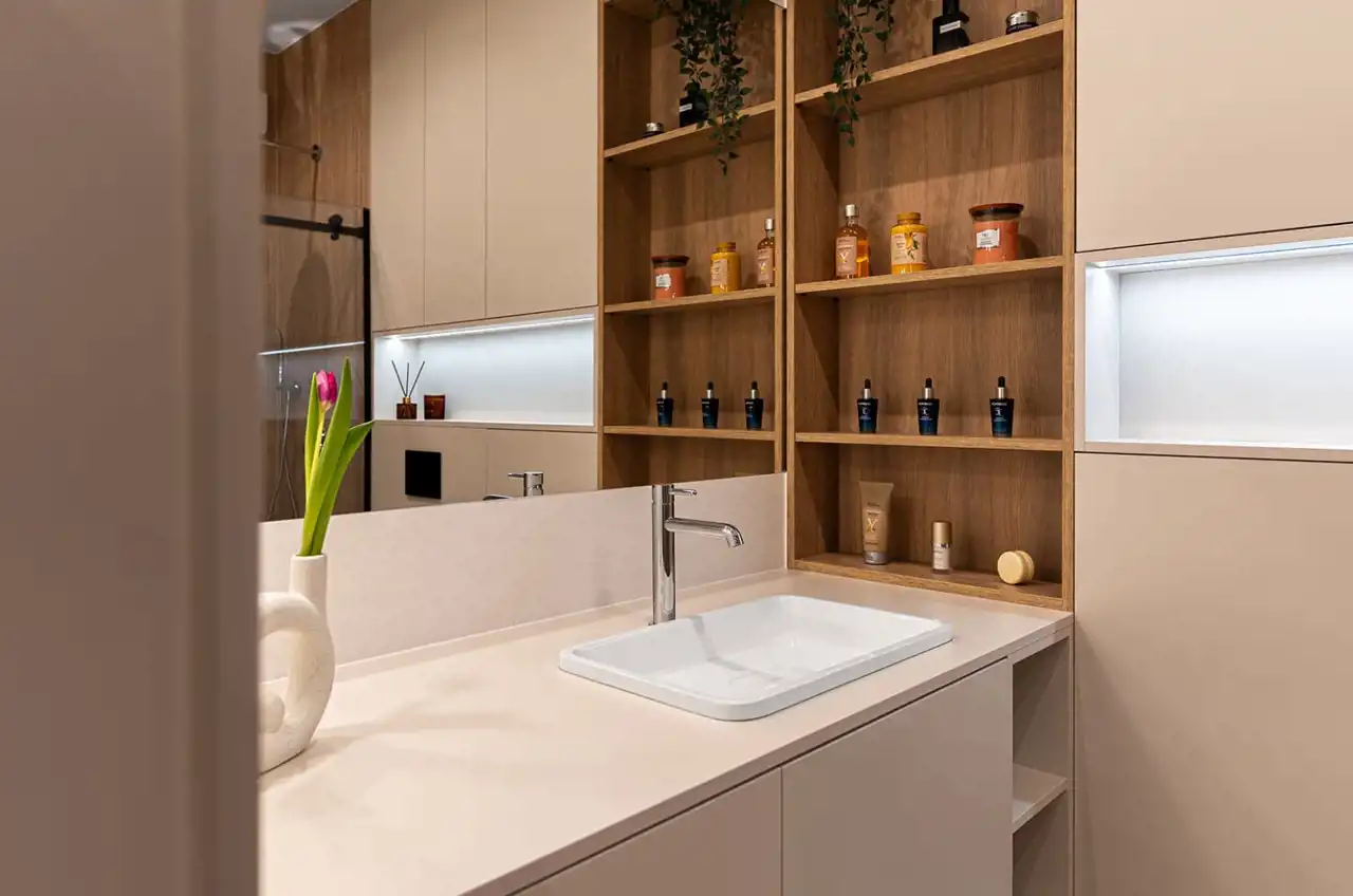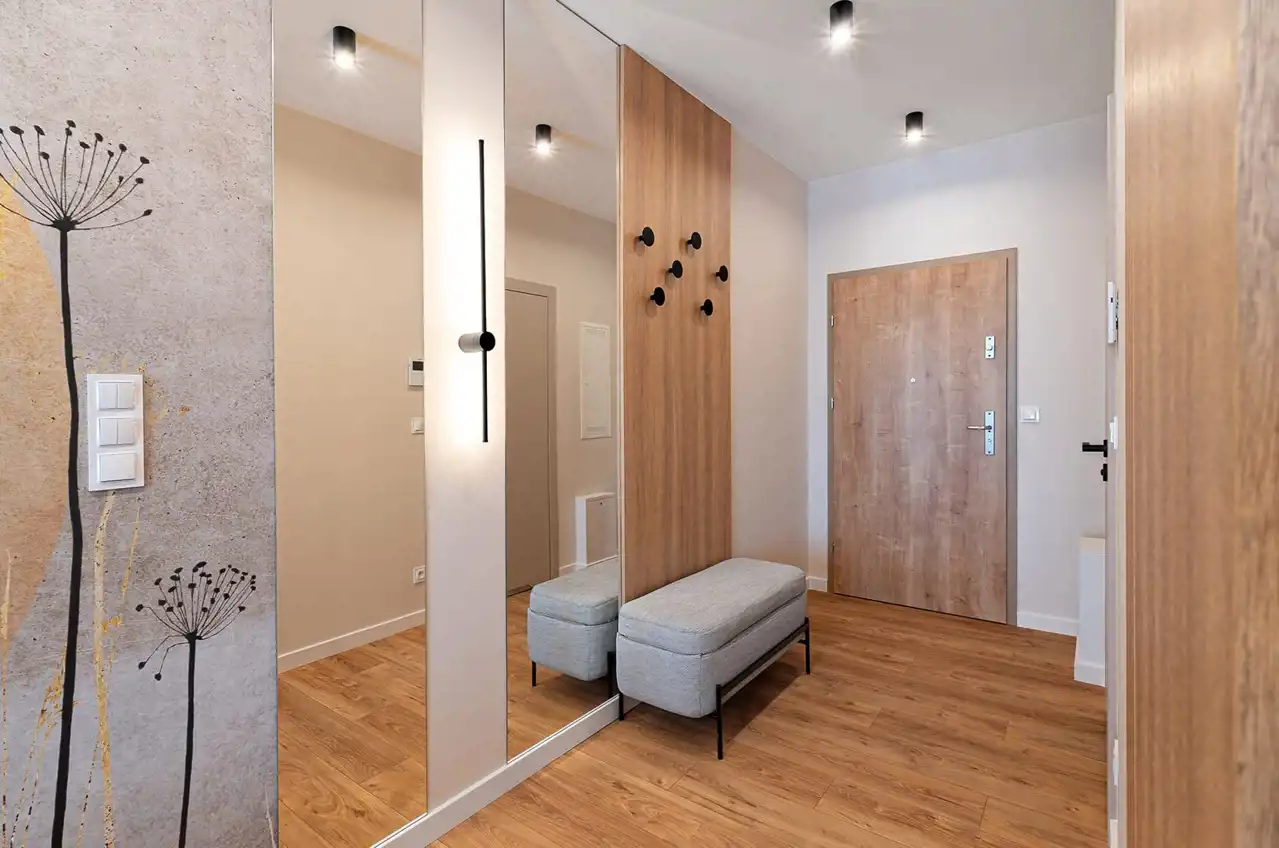 zabudowy stolarskie wykonane na wymiar (kuchnia, blat z funkcją biurka/strefy jadalnianej, szafa garderobiana, zabudowa w przedpokoju i łazience),