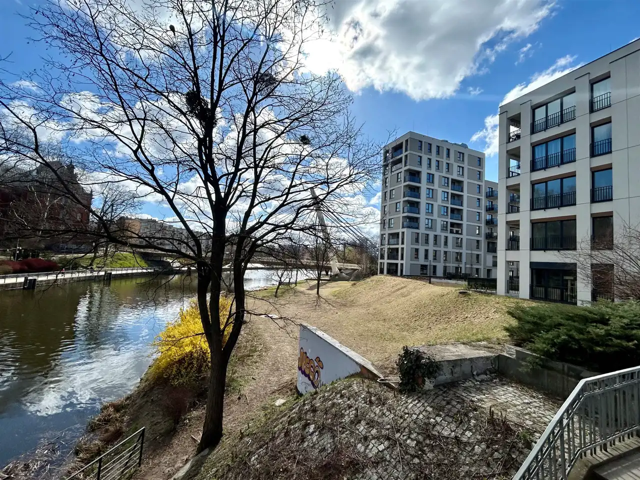 To jedna z najbardziej atrakcyjnych lokalizacji w mieście – ścisłe centrum, a jednocześnie blisko natury dzięki sąsiedztwu rzeki.
