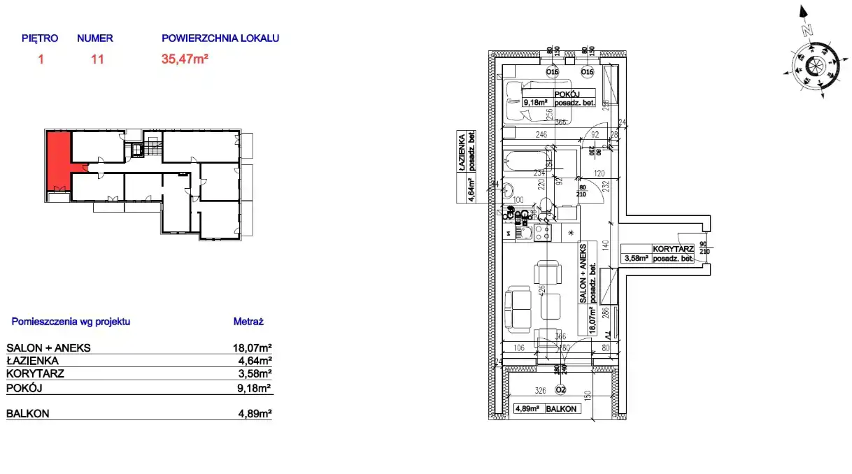 - Charakterystyka mieszkania 35.63 m2, 2 pokoje
