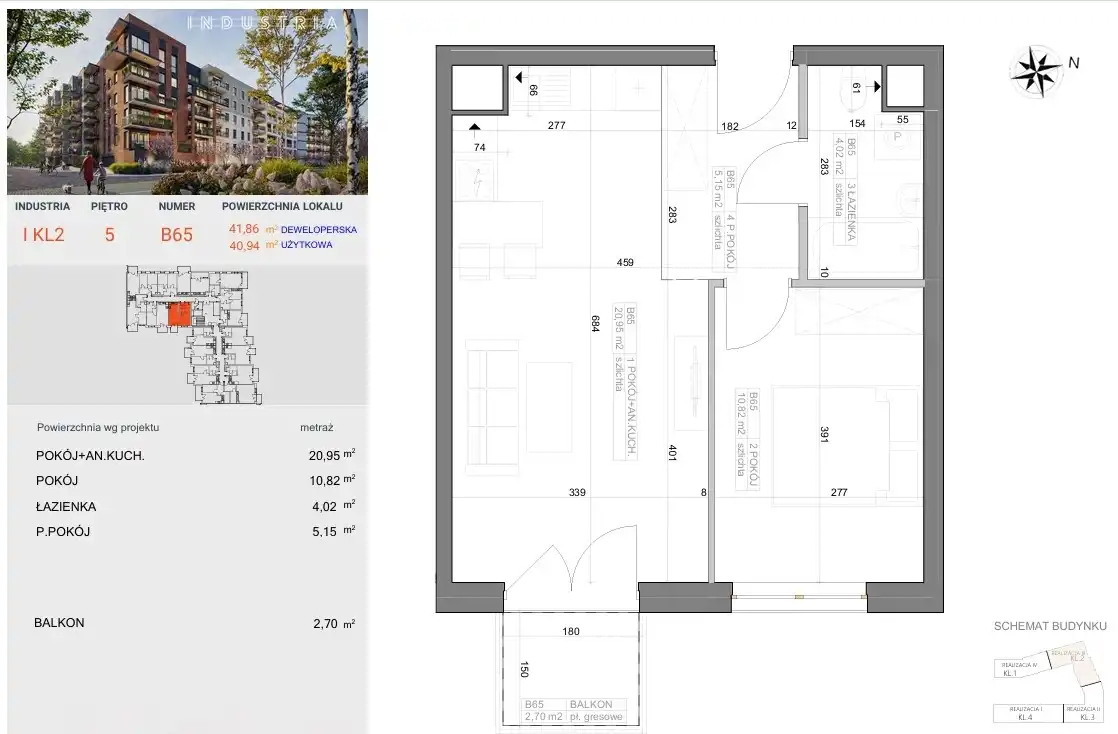 - Charakterystyka mieszkania 40.94 m2, 2 pokoje