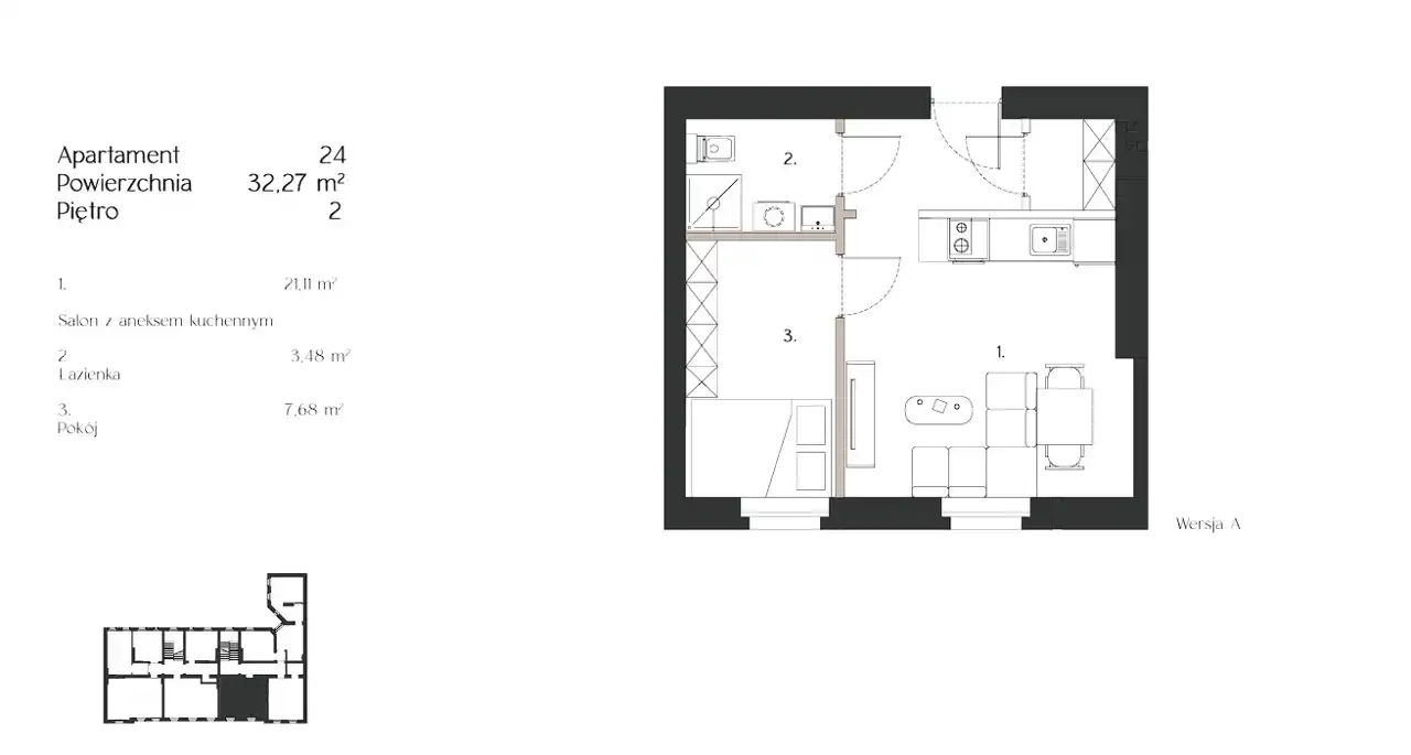 - Charakterystyka mieszkania 32.27 m2, 2 pokoje