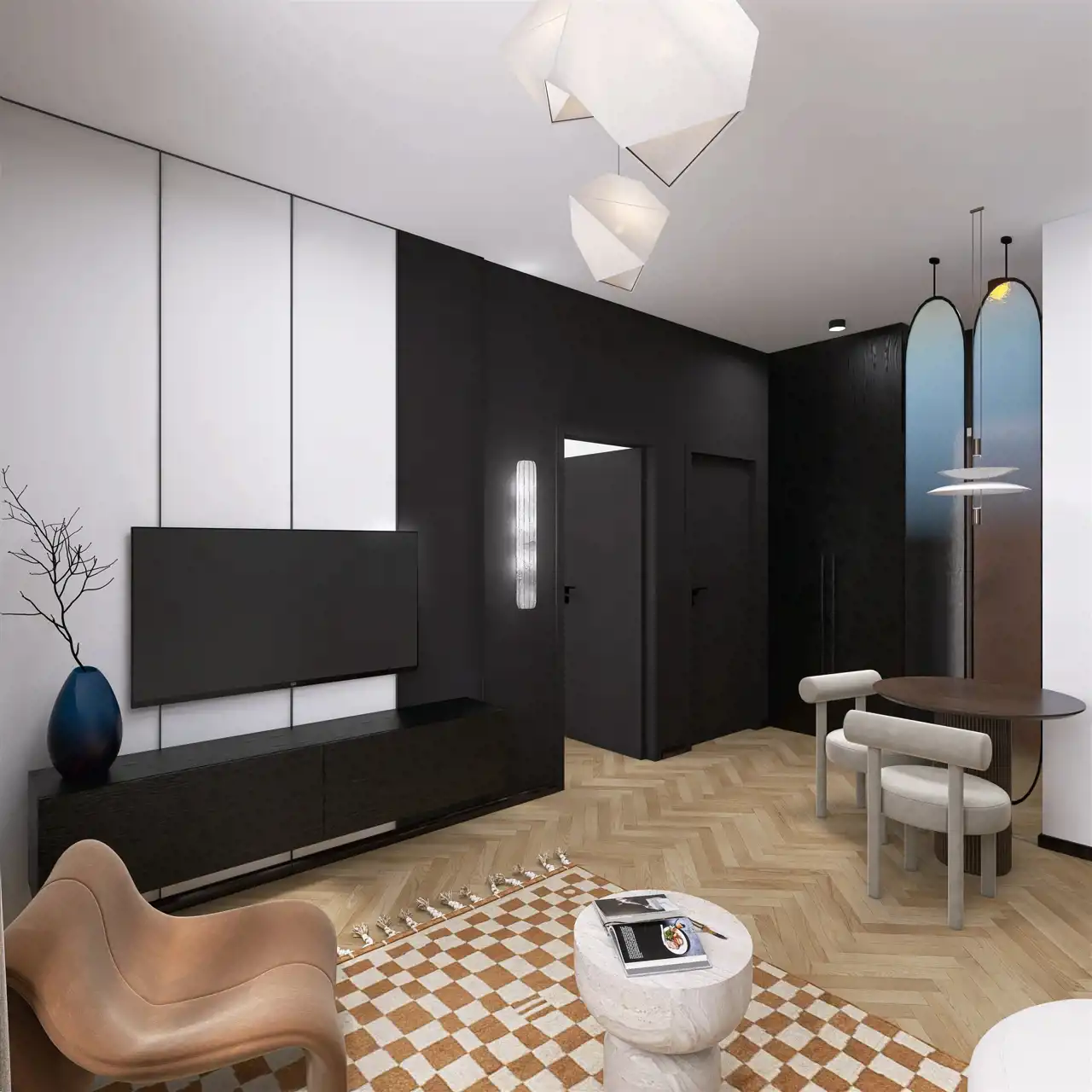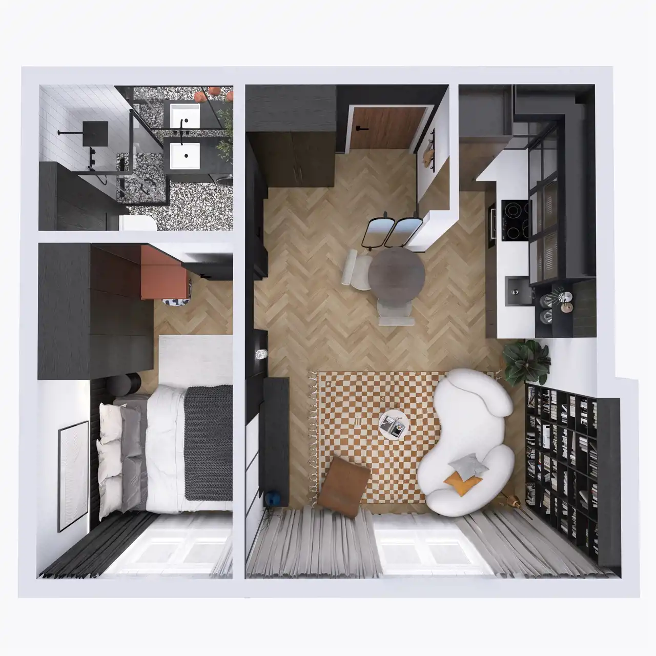 Układ składa się z salonu z aneksem kuchennym, sypialni i łazienki.