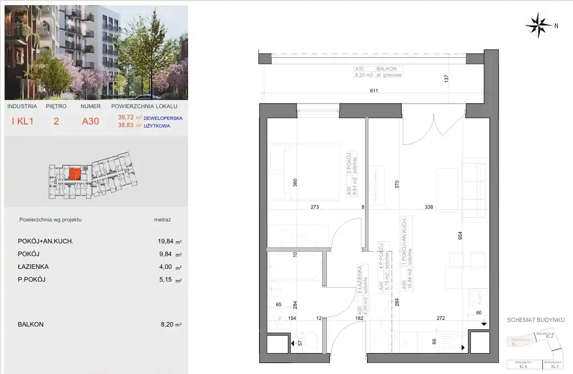 - Charakterystyka mieszkania 38.83 m2, 2 pokoje