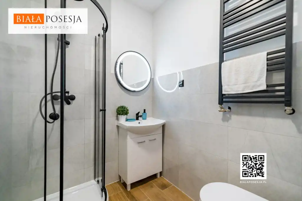 - Nowa łazienka z elegancką armaturą, prysznicem i oświetleniem LED.