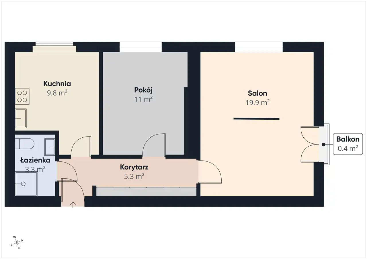 Mieszkanie składa się z przestronnego salonu, oddzielnej sypialni, osobnej kuchni, łazienki z WC oraz przedpokoju. Układ jest klasyczny i bardzo funkcjonalny, co daje szerokie możliwości aranżacyjne.