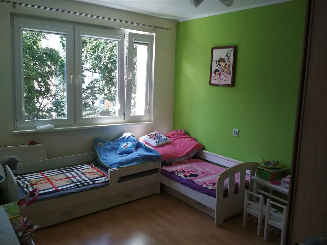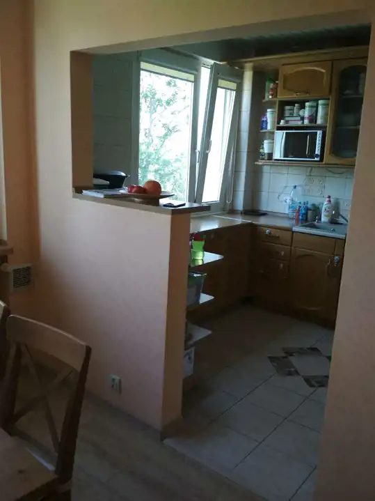 Mieszkanie czteropokojowe przerobione na trzy pokoje z kuchnio jadalnią. Istnieje możliwość powrotu do M 5..Na podłogach zostały położone panele.Siany w pokojach wykończone gładziami.W cenie zabudowa kuchni.Niski czynsz .