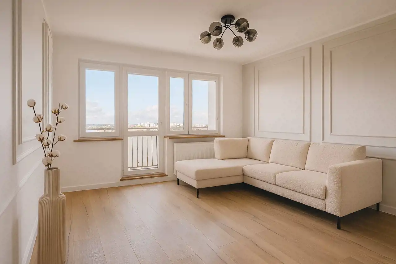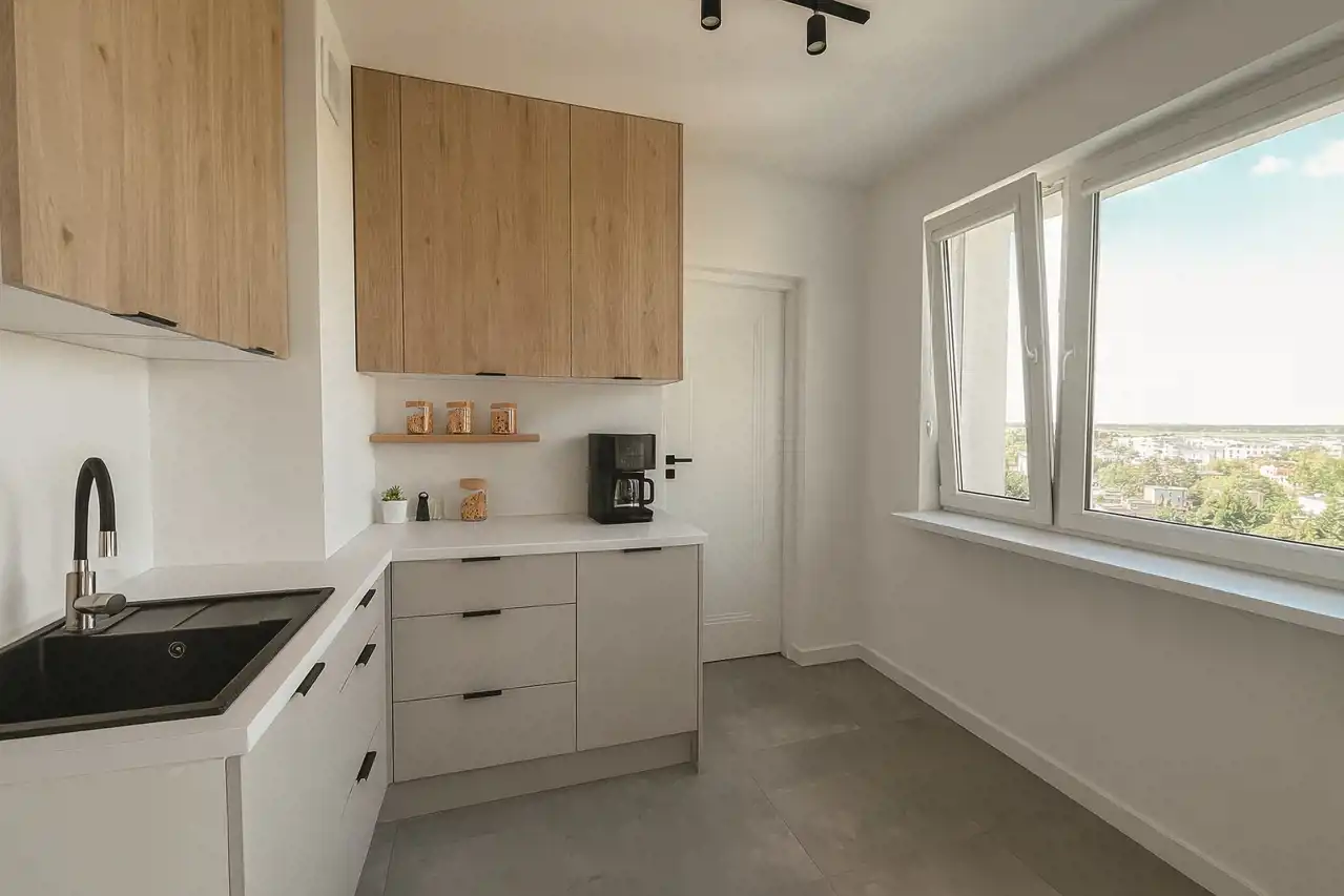 Okna w mieszkaniu wychodzą na 2 strony świata, co sprawia że jest jasne i słoneczne.