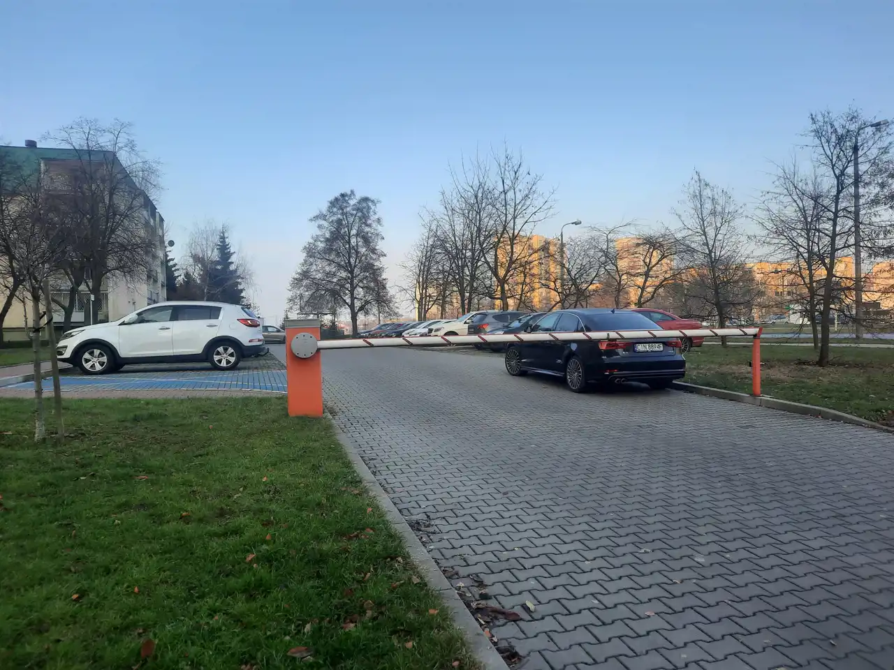 dużo miejsc parkingowych dla mieszkańców bloku ze szlabanem otwieranym za pomocą pilota,