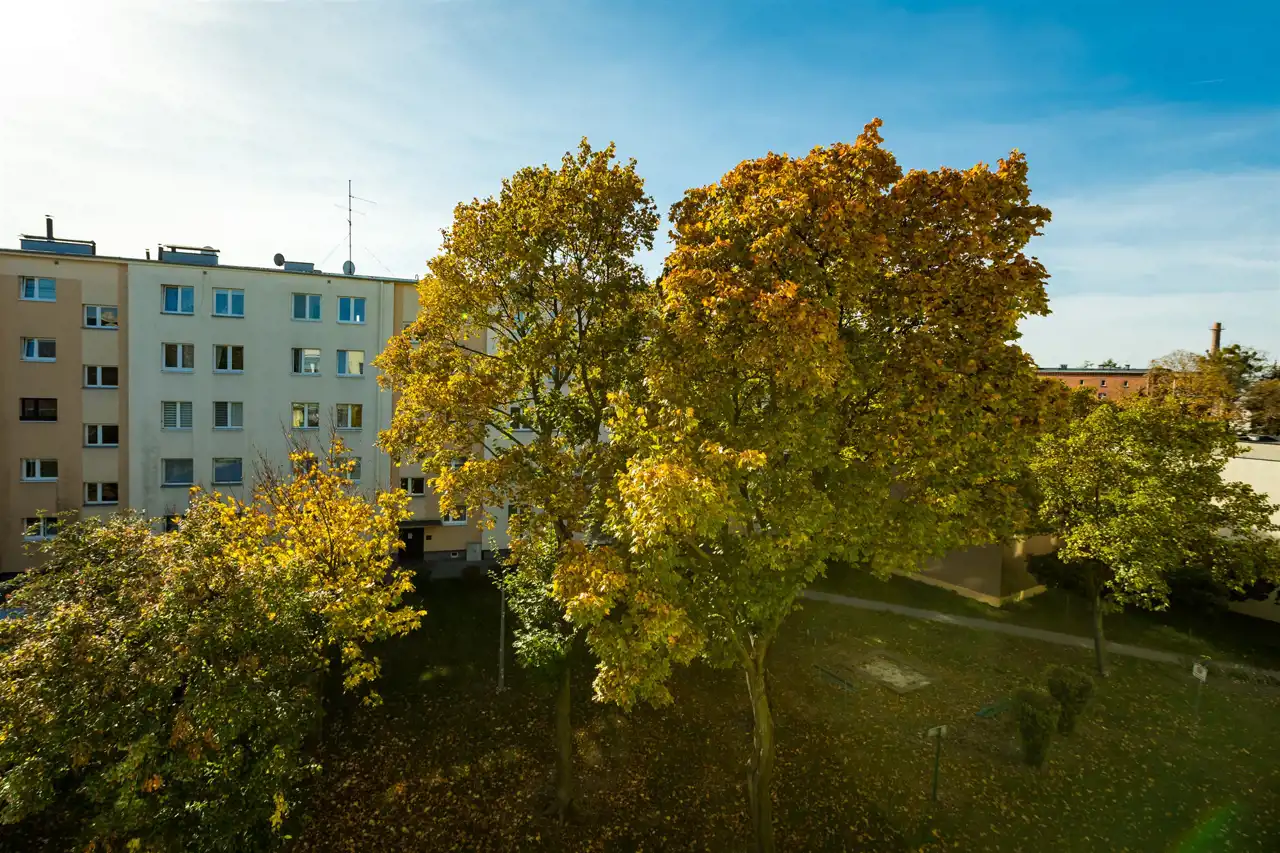 Jednocześnie blok jest skutecznie, ze wszystkich stron odseparowany od hałasu z sąsiednich ulic innymi budynkami oraz zadbaną zielenią.