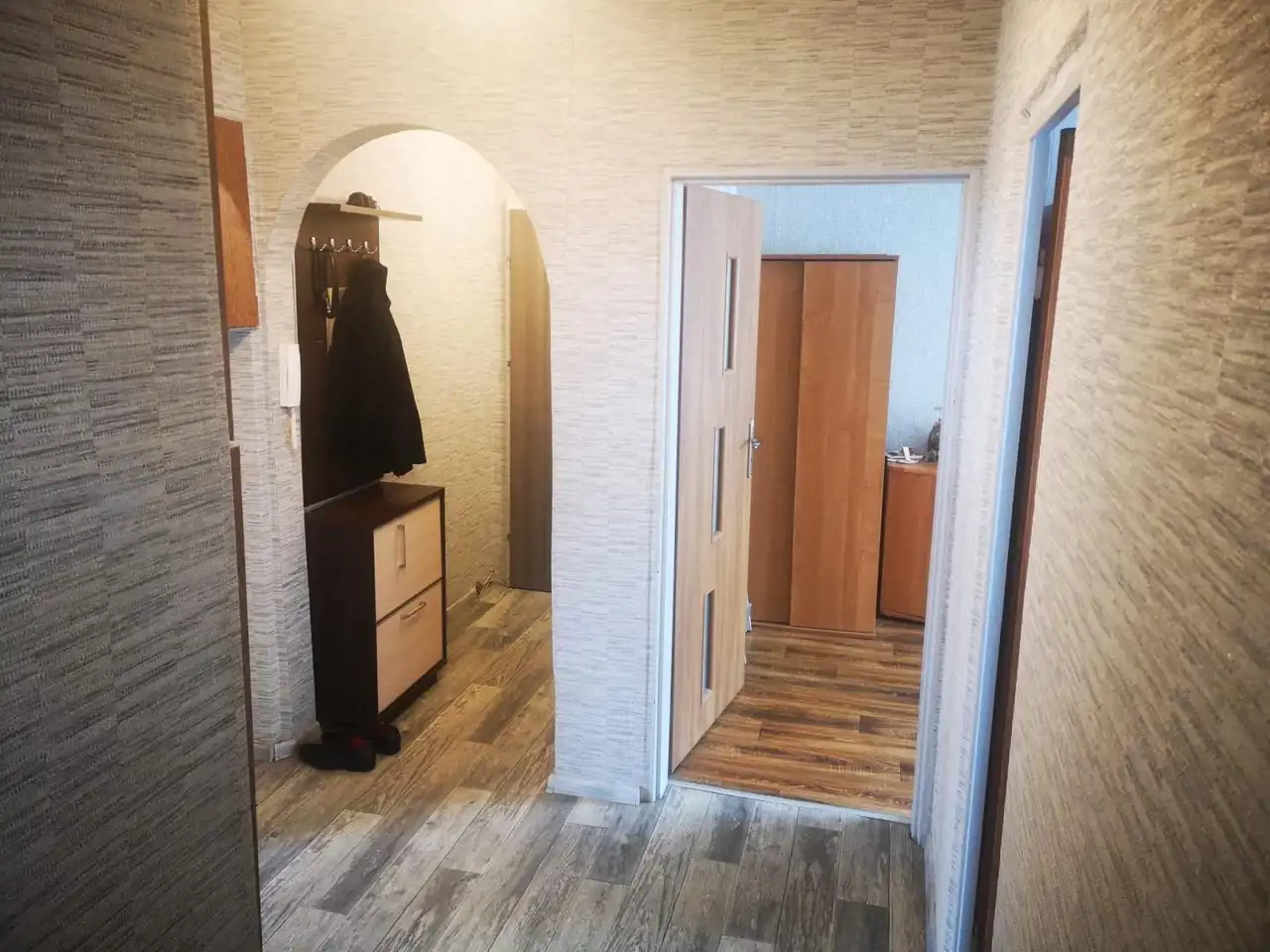Mieszkanie składa się z trzech ustawnych pokoi, osobnej kuchni, łazienki, toalety oraz przedpokoju.