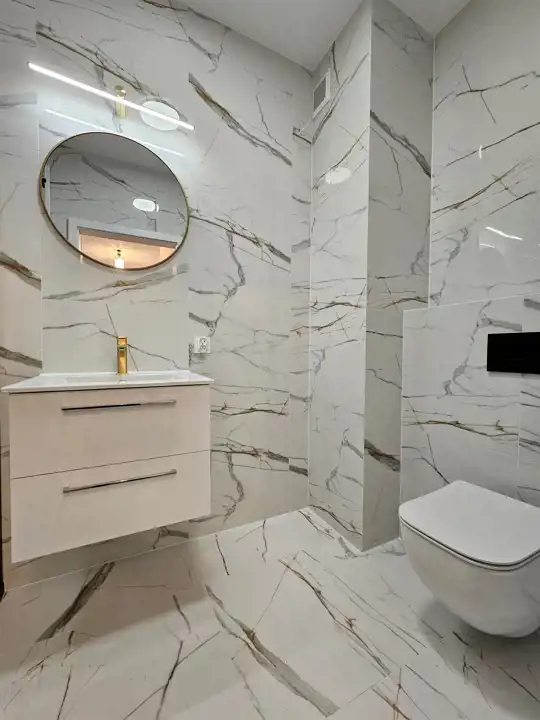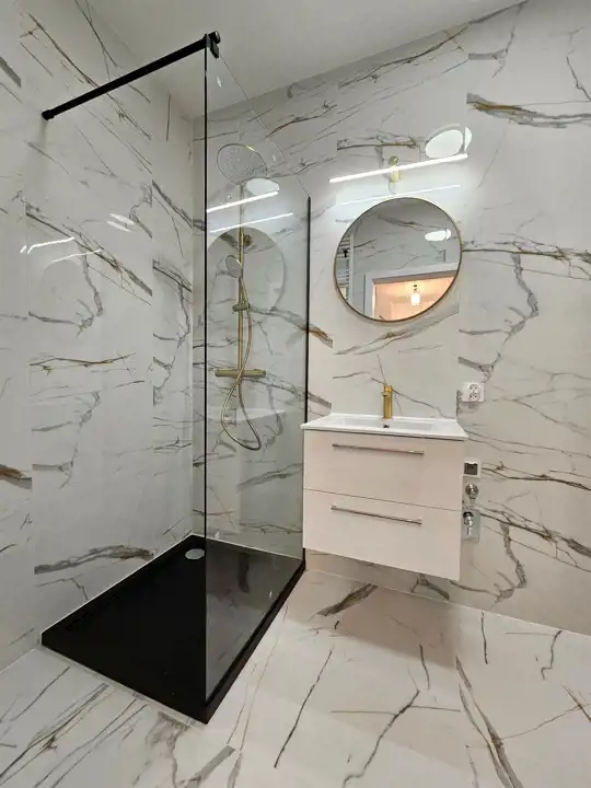 łazienka - kabina prysznicowa, wc, umywalka z szafką podwieszaną, lustro, oświetlenie