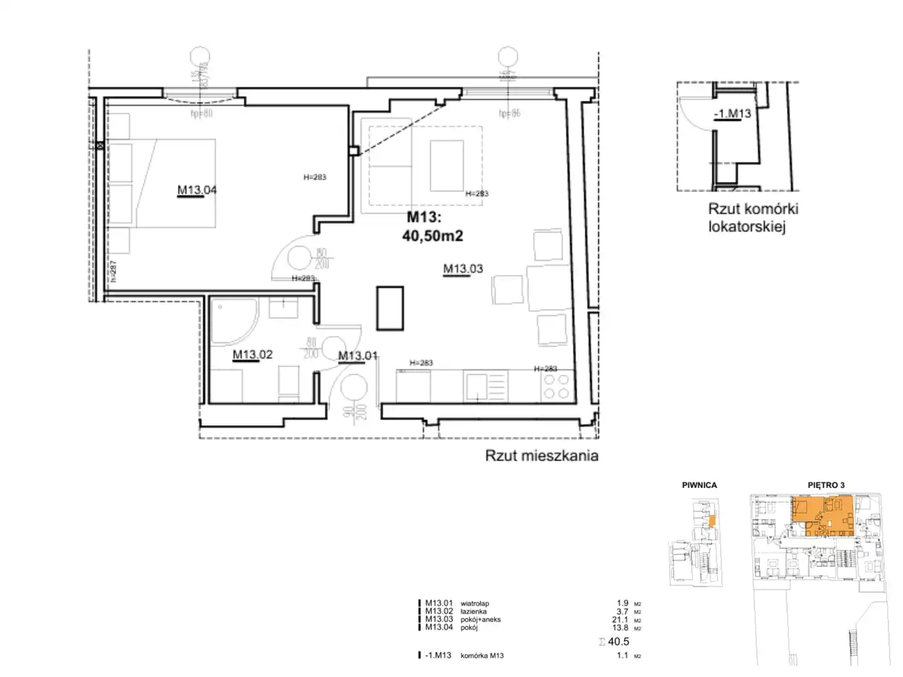 Do mieszkania przynależy balkon i piwnica o pow. 1,1 m2.