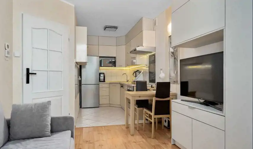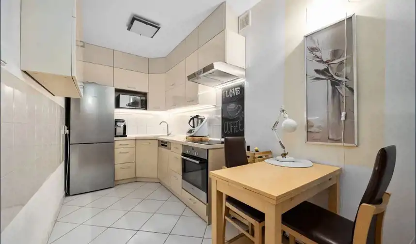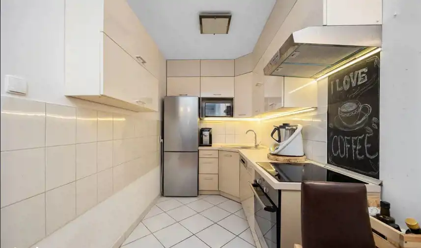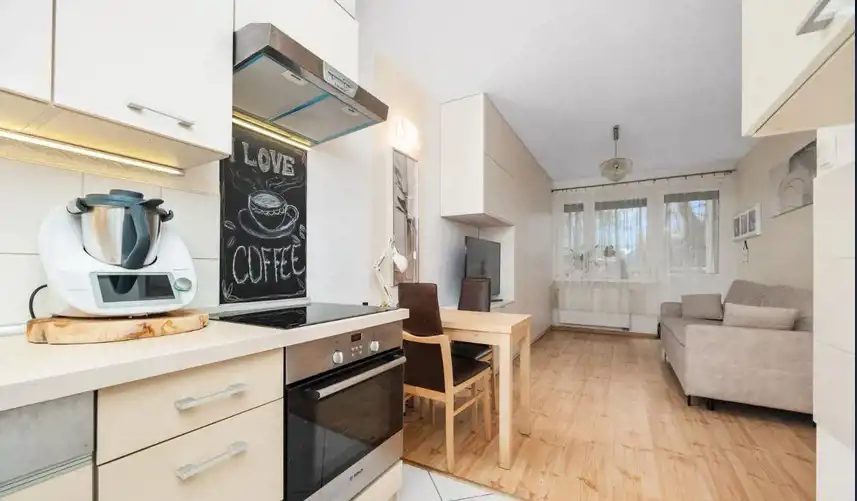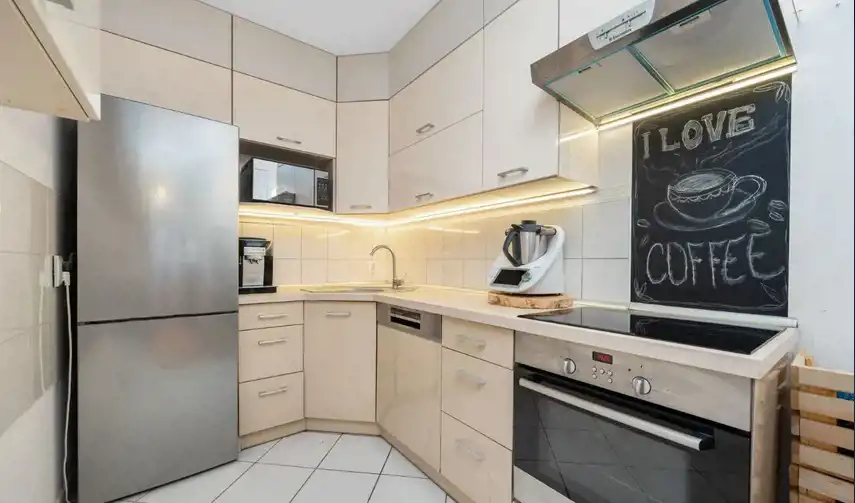 w cenie mieszkania: meble kuchenne robione na wymiar wraz ze sprzętem AGD (wolnostojąca lodówko-zamrażarka, piekarnik, płyta elektryczna, zmywarka, okap),