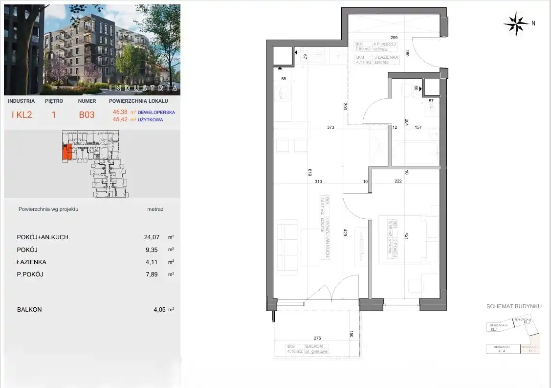 - Charakterystyka mieszkania 45.42 m2, 2 pokoje