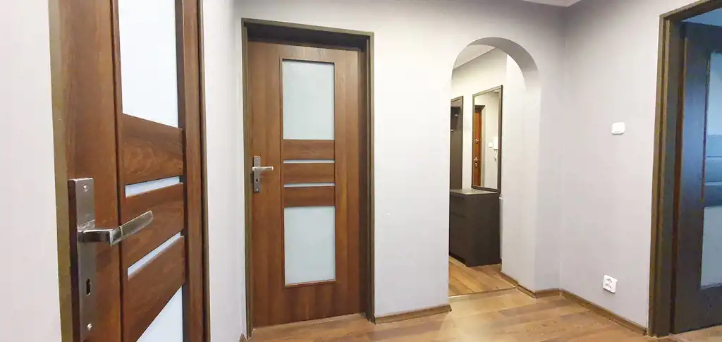 Zamontowane okna pcv oraz rolety wewnętrzne. Stolarka drzwiowa nowszego typu. W salonie podwieszany sufit. Na kaloryferach podzielniki ciepła. Zabudowa w kuchni i przedpokoju.