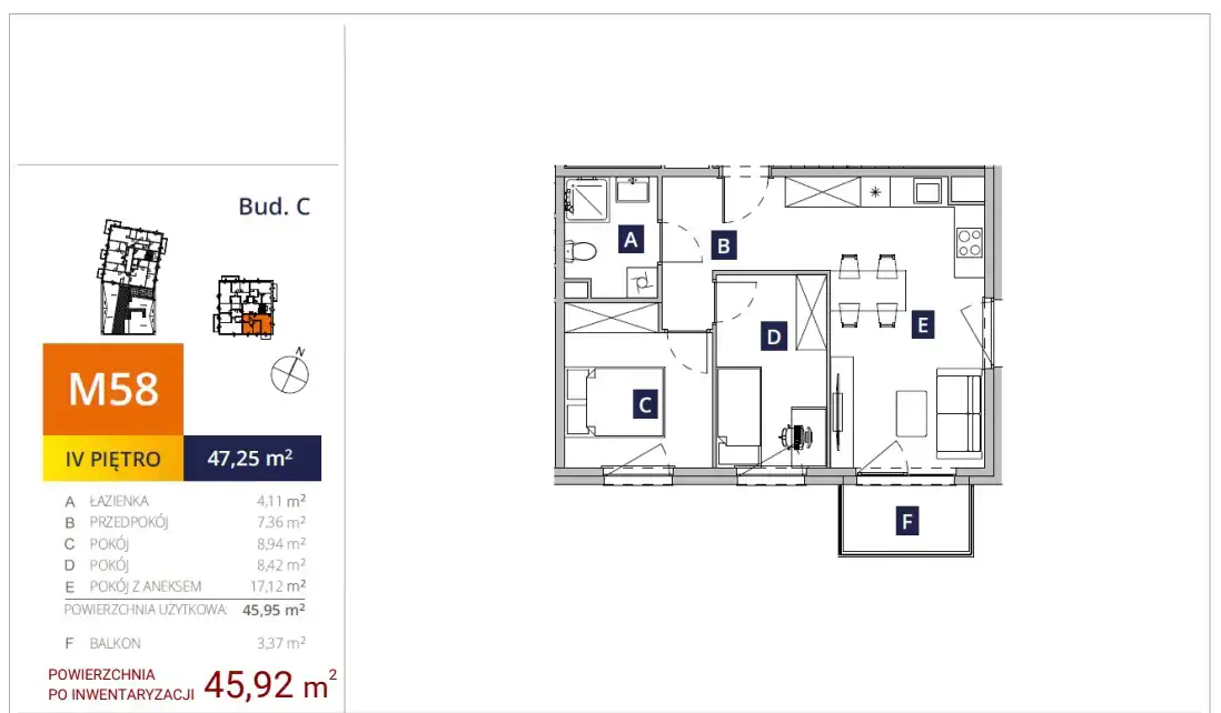 - Charakterystyka mieszkania 45.92 m2, 3 pokoje