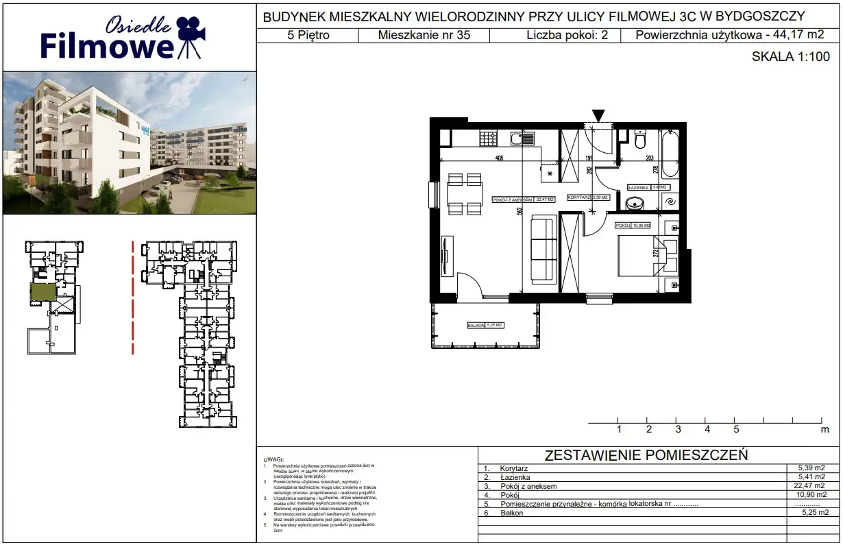 - Charakterystyka mieszkania 44.17 m2, 2 pokoje