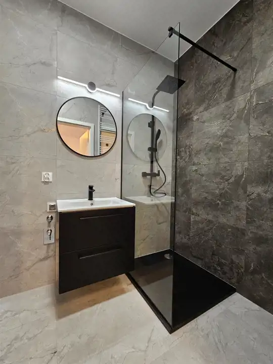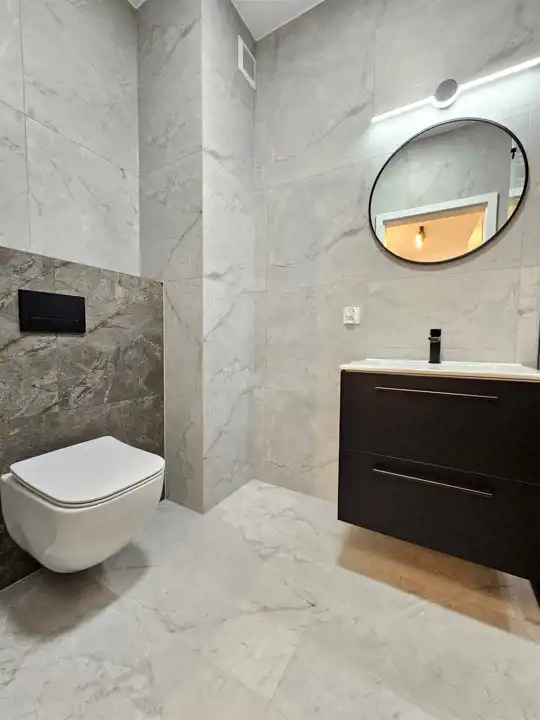łazienka - kabina prysznicowa, wc, umywalka z szafką podwieszaną, lustro, oświetlenie