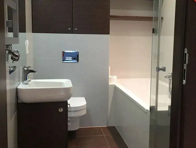 Łazienka z wc o pow. ok 6m2. - wanna, kabina prysznicowa, glazura i terakota nowoczesna.