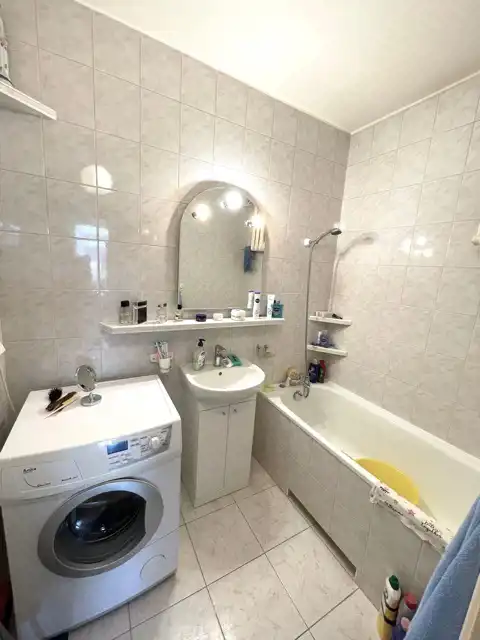Łazienka o pow. 3,30m2. wanna, glazura i terakota, umywalka pralka.