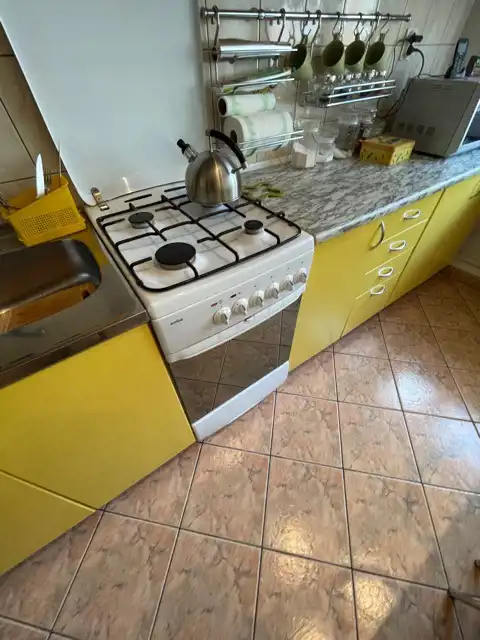 Kuchnia o pow. 7,70m2. Meble zadbane na wymiar, stolik, pochłaniacz, kuchenka z piekarnikiem, firanki.
