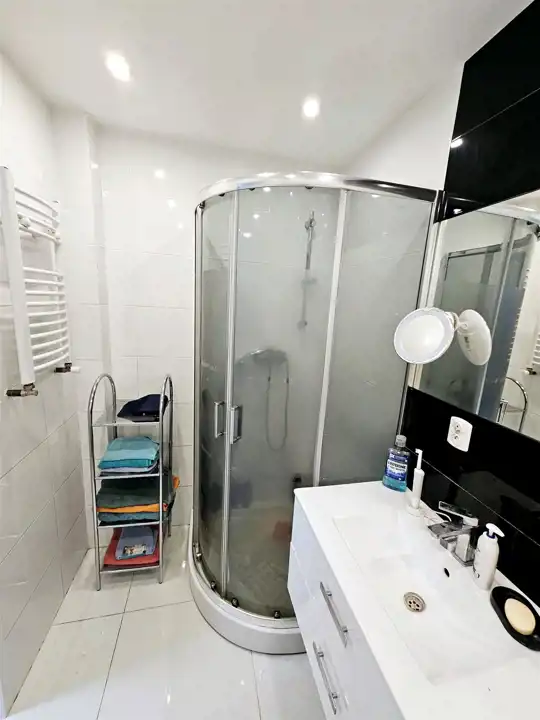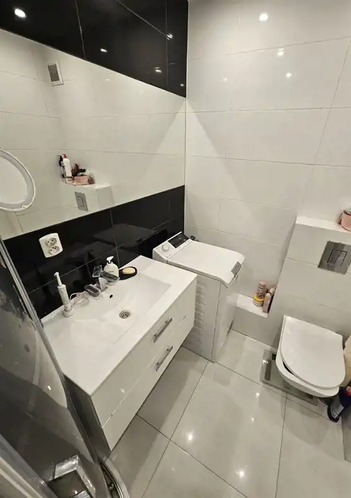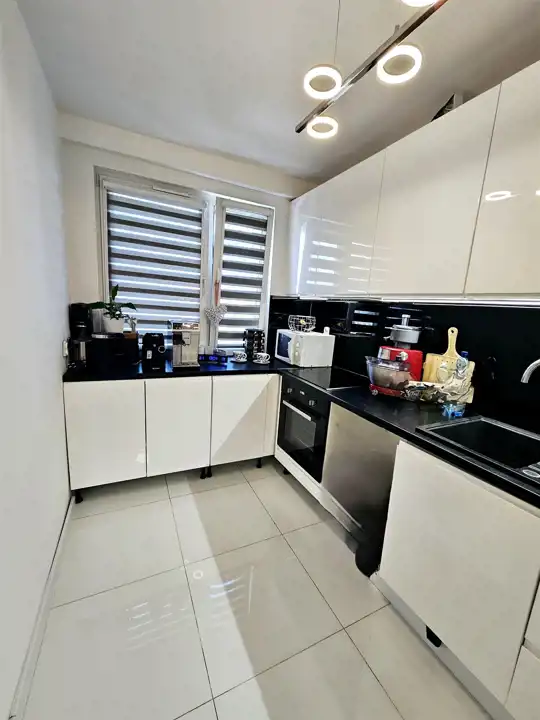 Nowoczesna, biała zabudowa kuchenna dobrze skomponowana z dużymi, białymi płytkami na podłodze i ścianami. Lodówka osobno. Uwagę zwraca nowoczesna łazienka - utrzymana w bieli, ale dla kontrastu zastosowano też ciemne płyty.